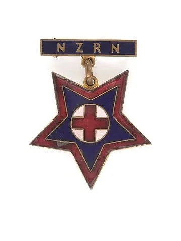 A medal with a Star of David shape, featuring a red cross in the center and a rectangular bar with the letters 'NZRN' at the top.